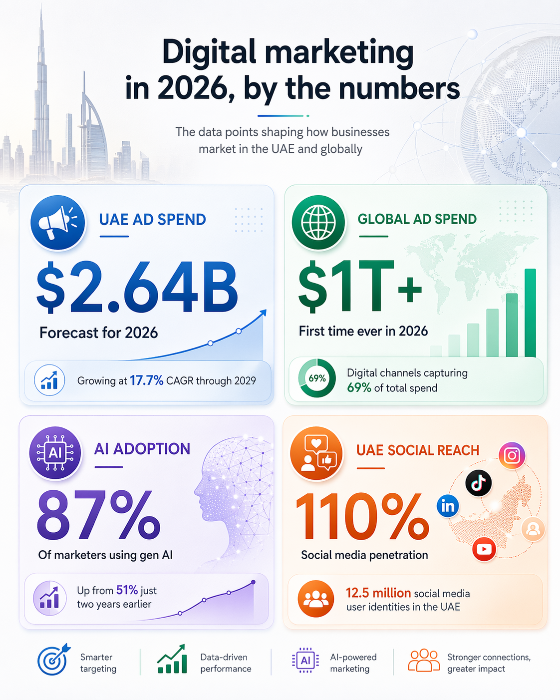 Marketing budgets are bigger than ever, but where the money goes looks nothing like it did three years ago. According to Statista, UAE digital ad spending is forecast to reach USD 2.64 billion in 2026, growing at a compound annual rate of 17.7% through 2029.¹ Globally, Dentsu forecasts that total advertising spending will surpass USD 1 trillion for the first time in 2026, with digital channels capturing nearly 69% of that total.²